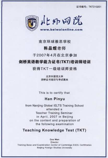 环球雅思除雅思托福培训为主,力推剑桥大学国际资格证书考试/认证四大系列系列:TKT剑桥英语教师证书,ICFE财务英语资格证书, ILEC 南京剑桥法律英语国际证书, BULATS博思职业外语水平考试。到江苏唯一考点南京环球报名学习,拿剑桥英语教师资格证书国际护照!南京环球剑桥英语教师证书国际[考点号:CN509 NJ]考试/认证中心,并成为剑桥英语教师证书国际培训基地。而韩品煜校长是江苏省内仅仅持有国际剑桥大学国际资格证书考试TKT一级培训师资格。